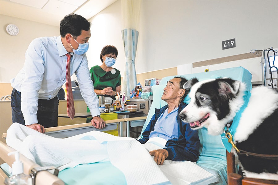 Health Minister Ong Ye Kung and Central Singapore District Mayor Denise Phua visiting Mr Tay Jiak Mong, 71, at Dover Park Hospice on March 19, as part of the official opening ceremony of Tan Tock Seng Hospital Integrated Care Hub. Mr Tay is accompanied by border collie Jacque during a pet-assisted activity. ST PHOTO: GIN TAY